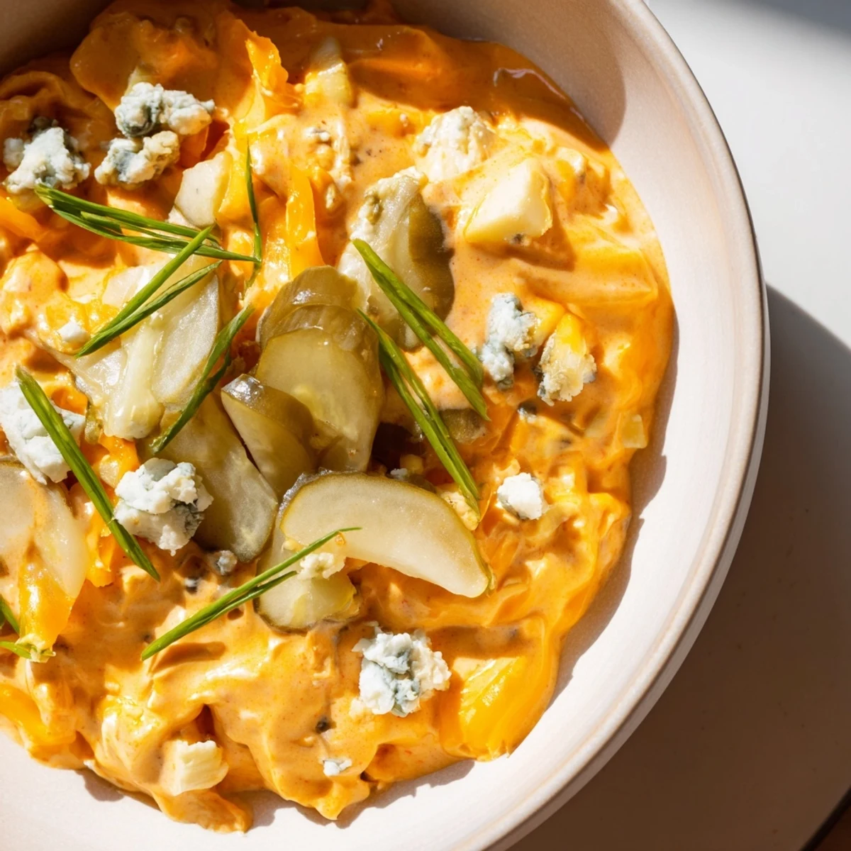 This zesty dip brings together the bold heat of buffalo wing sauce with the satisfying crunch of chopped dill pickles. The creamy base blends cream cheese, sour cream, and mayonnaise, while shredded cheddar and optional blue cheese add rich depth. Fresh chives and garlic powder round out the flavors, creating a balanced bite that's both tangy and savory.