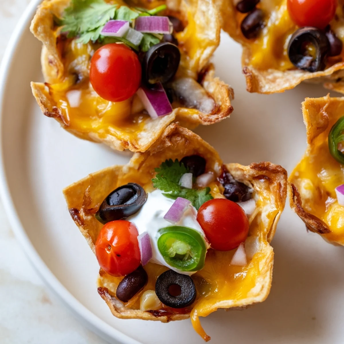 These individual nacho cups transform scoop-style tortilla chips into edible vessels filled with melted cheddar and Monterey Jack. Each cup gets loaded with black beans, diced cherry tomatoes, sliced black olives, red onion, and optional jalapeño slices before baking until bubbly. A quick bake at 375°F melts everything together while keeping the cups crisp. Top with sour cream and fresh cilantro for a cool contrast to the warm, cheesy filling.