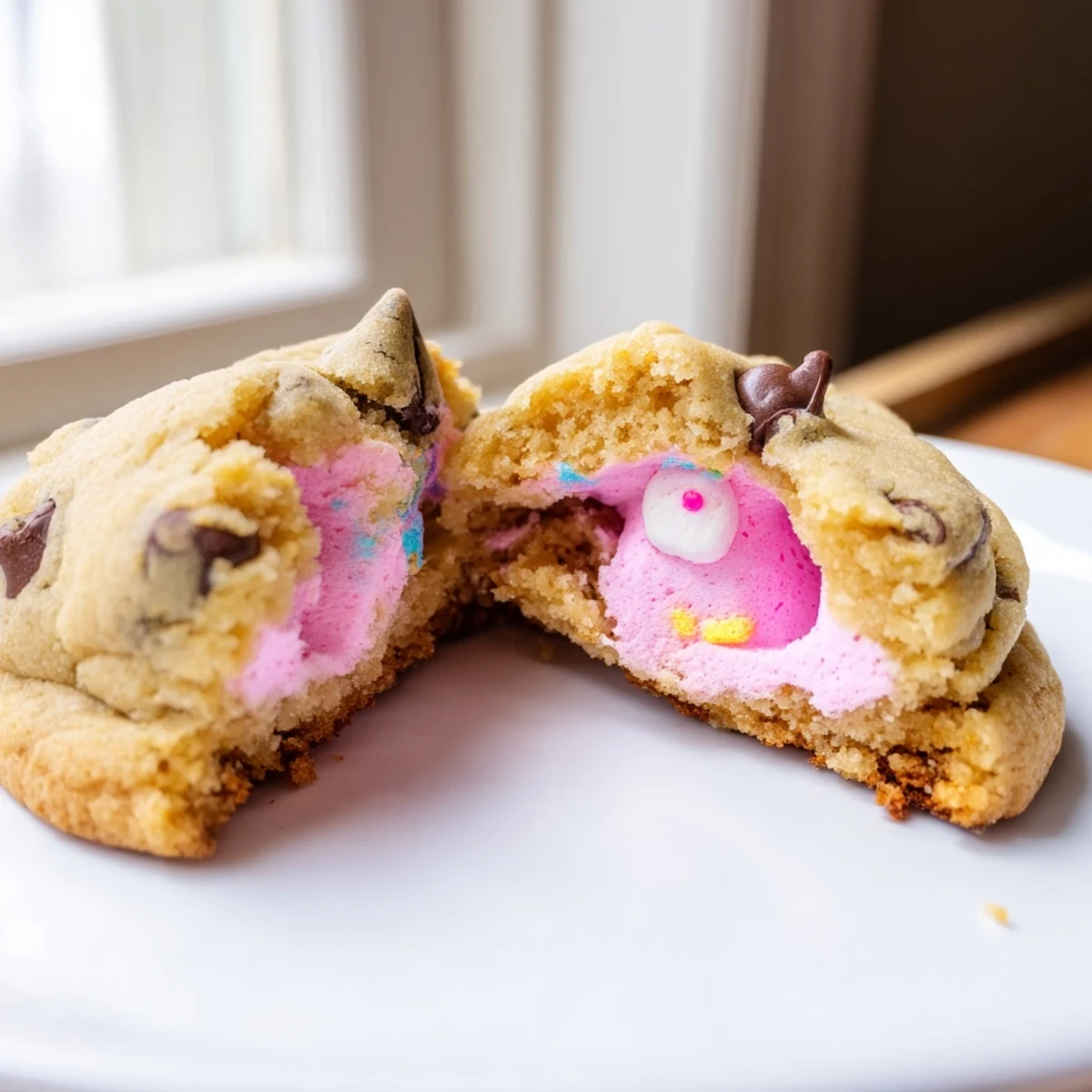 These soft and chewy chocolate chip cookies hide a colorful marshmallow Peep surprise inside, creating a festive Easter treat that delights both kids and adults. The combination of rich chocolate chips and sweet, fluffy marshmallow creates a perfect balance of flavors and textures. Each cookie contains a fully encased Peep that melts slightly during baking, resulting in a gooey, colorful center that makes these cookies ideal for spring gatherings and holiday celebrations.