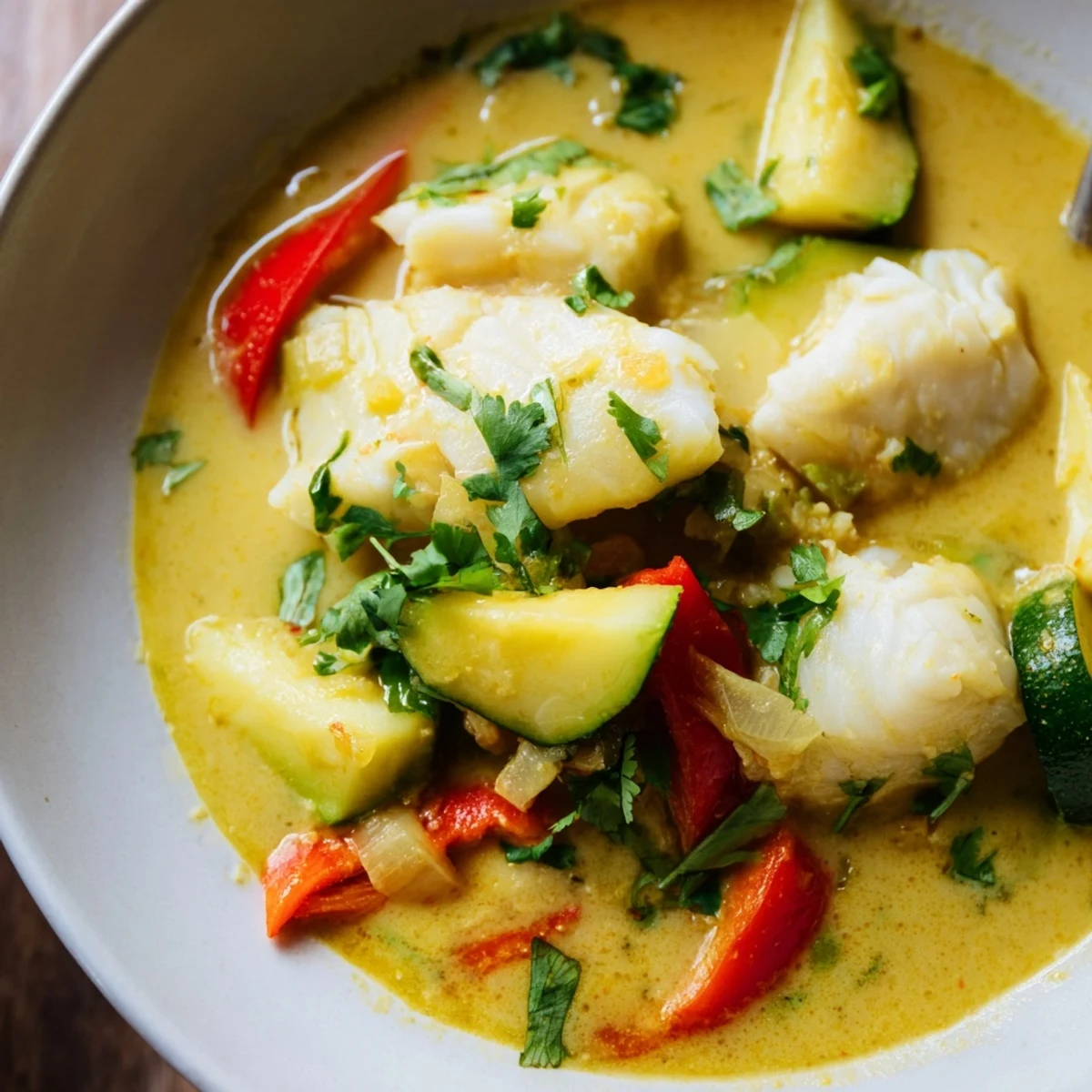 This light yet satisfying coconut white fish stew brings together tender chunks of flaky fish, fresh vegetables, and aromatic spices in a rich, creamy coconut broth. The combination of turmeric, coriander, fresh ginger, and a hint of heat from chilies creates layers of flavor that develop beautifully as the stew simmers. Ready in just 40 minutes with only 15 minutes of active preparation, this dish is perfect for busy weeknights when you want something nourishing and delicious.