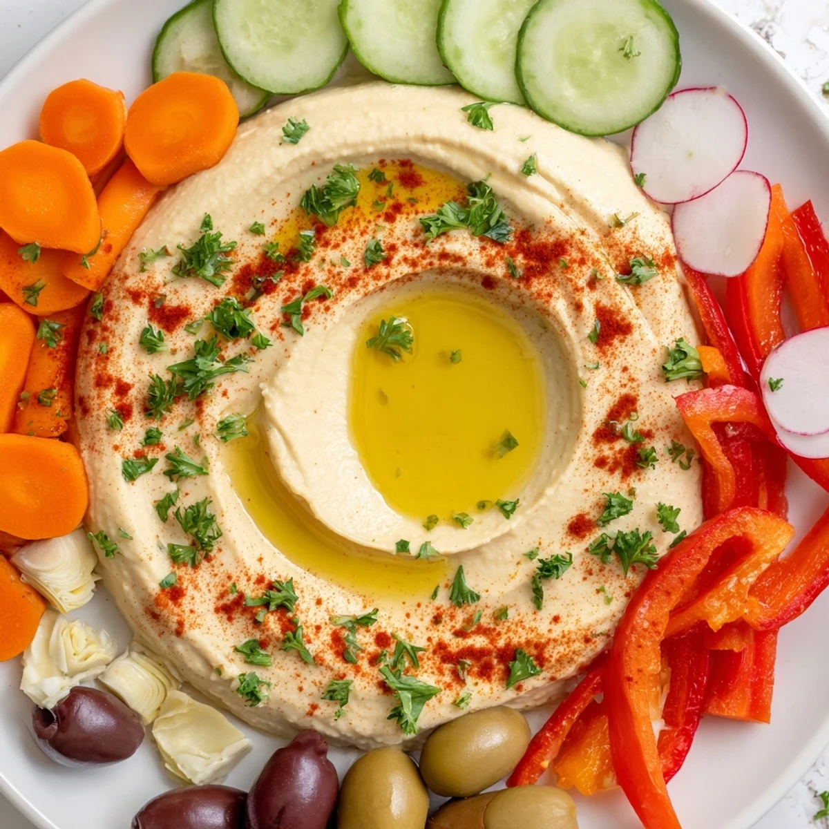 This Mediterranean platter showcases creamy chickpea purée blended with tahini, olive oil, lemon, garlic, and warming cumin. Surrounded by crisp cherry tomatoes, cucumber slices, baby carrots, red bell pepper, radishes, olives, and artichokes, it offers a colorful and wholesome combination. Garnished with smoked paprika and fresh parsley, the platter is ideal for sharing with pita or gluten-free crackers. A quick 20-minute assembly brings vibrant flavors and contrasting textures together, perfect as an appetizer or light meal.