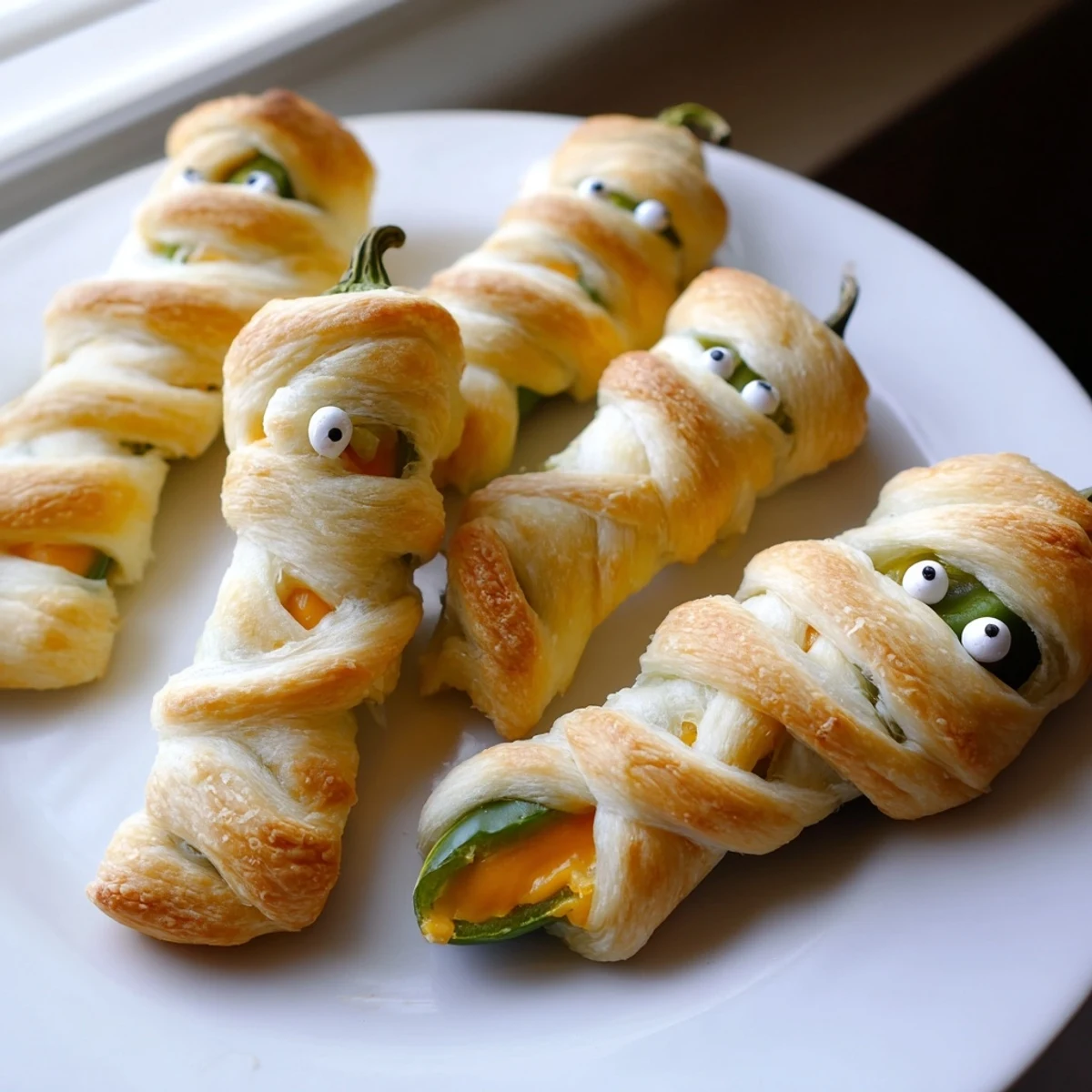 These spooky mummy-inspired jalapeño poppers combine fresh jalapeño halves with a rich, creamy filling of cream cheese, sharp cheddar, garlic, and smoked paprika. Each stuffed pepper gets wrapped in thin crescent dough strips to create those classic bandage look. After baking until golden brown and crispy, attach candy eyes or black olive bits to bring your mummies to life.