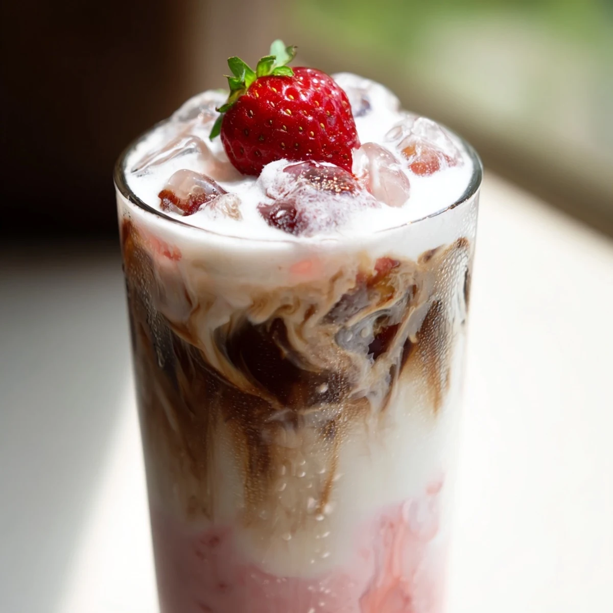 Pour the strawberry cream mixture over ice first, then slowly drizzle the cold coffee over the back of a spoon to create distinct layers and a beautiful marbled presentation.